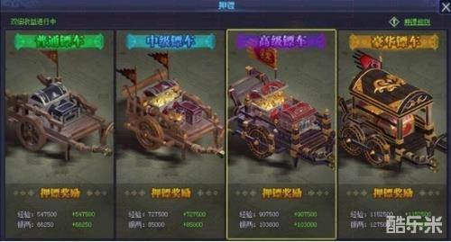 双倍押镖时间是晚上七点十五分到七点四十五,半个小时的时间,去唐门找大镖师,四十五级以上就能开启押镖活动。镖车有四种品质,最高的是豪华镖车,需要用押镖令刷出来,如果令牌不够,可以用元宝。个人觉得平民玩家没有那么多元宝,那么至少也得刷个紫色的镖车,否则真心亏损不少。