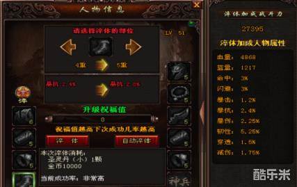 今天终于50级了,挂了一晚上不容易,终于可以开始淬体了。也许有人不知道按钮在哪里,实际就在人物界面,左边的位置,如图