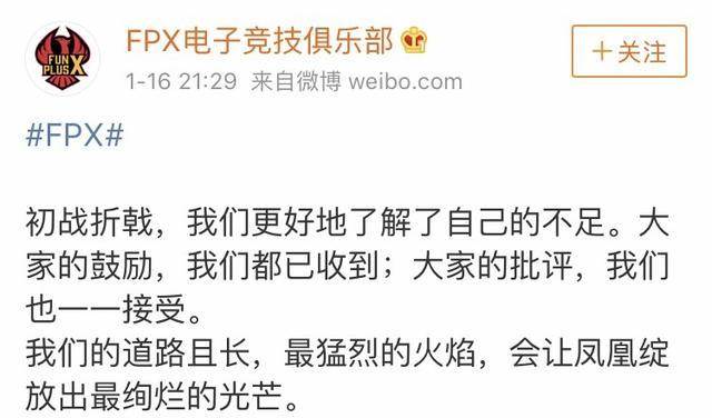 赛后FPX官方微博更新动态,称首战落败认识到了不足但路还长自己会更加努力。原文如下: