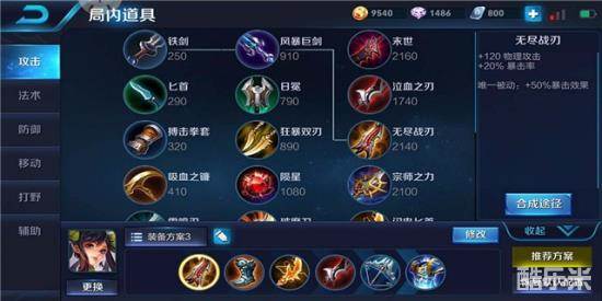 首选无尽战刃不仅看中其增加物理攻击,其被动增加暴击效果令暴击伤害提高,为中期快速清线推塔打下基础。