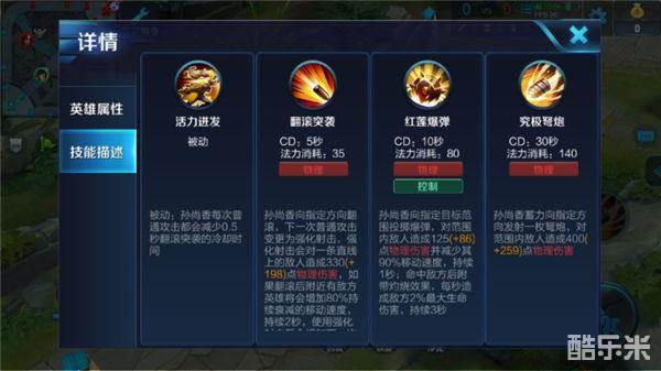 一技能-翻滚突袭:孙尚香朝前方翻滚,并强化下一次普攻,对一条直线敌人造成物理伤害,(附近有敌方英雄将获得短暂的移速加成)。