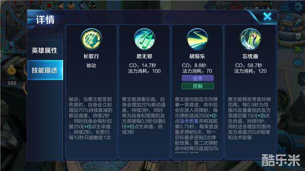 被动技能-长歌行:被攻击的蔡文姬会立刻获得持续衰减的移动速度加成,同时自身会回复2秒的血量,每10秒触发一次,被动技能提供蔡文姬持续战场作战能力,只要蔡文姬有蓝量便是不需要回家补充,可以游走寻找队友,不断给队友打辅助。