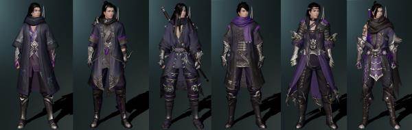 服饰遵从暗紫色衣物加银饰,多套外观各有特色,戴上面具更加神秘,冷静的双眼于黑夜里观察四周动静。
