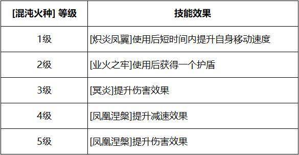 同时,不断追逐凤凰的凤凰火,对于火种的运用也更加纯熟,被动技能“混沌火种”每升一级便会强化一个技能。随着该技能等级的提升,凤凰火在使用“炽炎凤翼”后能短时间提升自身的移动速度,在使用“业火之牢”后能获得一个护盾。不仅如此,“混沌火种”还能提升“冥焰”的伤害效果,以及提升“凤凰涅槃”的减速与伤害效果。