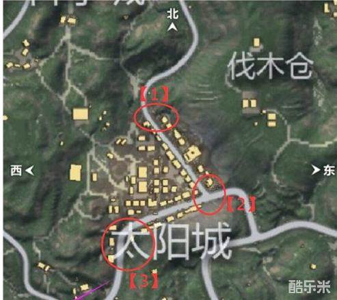 如果我们在“太阳城”资源区没有和其它的敌人争抢“双子大楼”的话,那么我们的落脚点就最好选择太阳城周边的【1】【2】【3】三个位置,而我的首要推荐地点是【3】的位置,因为这边从地图上看是“太阳城”的南部,而且如果发现敌人太多容易被包围的情况下,可以先往西南部撤离,临近马路的优势可以率先找到车,并且西南部公路沿途都有不少的建筑能保证我们一定的发育能力!