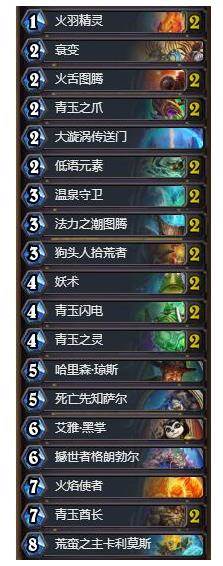 元素青玉萨,这套卡组由于加入了低语元素,可以使青玉成长的更大几号,或是配合元素的战吼效果,都使得这套卡组强度高了很多,但是这套卡组没有太大的亮点,面对宇宙术,魔块术,青玉德这些慢速卡组,后期强度不够厚,而打快攻又不是能很好地苟活,这就是这套卡组的鸡肋支出,很难火起来的卡组。