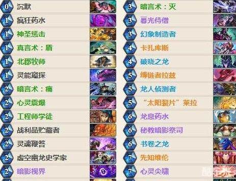 我们起手找北郡牧师、工程师学徒、战利品贮藏者、虚空幽龙史学家。对上快攻卡组时可以留疯狂药水、卡扎库斯、破晓之龙、灵魂鞭笞;对上控场卡组时可以留拉兹、暗影视界、苦痛侍僧。使用坦普卢斯时需要对对手的卡组有足够的了解,同时也需要一定的魄力。当然,很多情况下我们作为龙系走A牧也是可以取胜的。