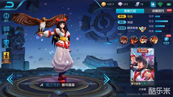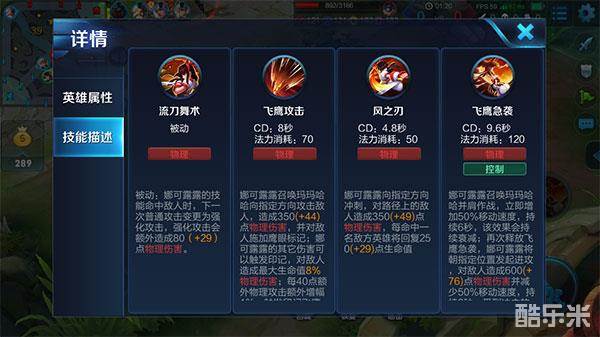 三技能-飞鹰急袭: 娜可露露的核心技能,是她切入敌方后排最关键的技能,释放时会召唤玛玛哈哈一同作战,可以提升娜可露露的移速,下一次释放能对范围内的敌人造成减速和伤害,还可以降低敌人的输出,配合一技能能对敌方脆皮造成很大的威胁,在前中期三技能的移速加成也让娜可露露拥有非常强的gank能力。