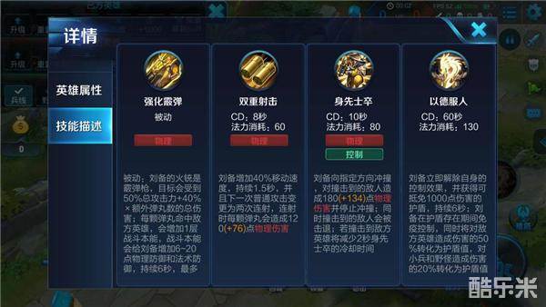 被动-强化霰弹:刘备火铳发射的霰弹在命中敌人时,将在短时间内增加自身的物理、法术防御,该效果可多次叠加,但有上限。刘备每次发出的霰弹,只有中间的两发能触发暴击、装备效果,并且建筑物将不受额外弹丸的影响。