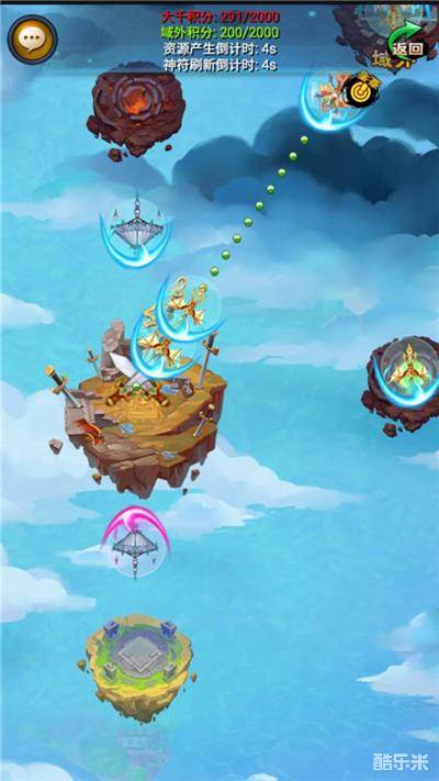 圣渊大陆,四个神符岛,分别有蓝色、紫色、绿色、红色四个符,90秒一轮换;大千和域外岛为两家初始岛屿,游戏刚开始时有6个破灵珠,90秒增加三个;中央战斗岛,十秒给一次资源,按照在岛内人数,具体人数对应的资源笔者没有注意;圣渊大陆不同于神域争霸的一点,杀人会增加十点资源。谁先达到2000点,谁胜。