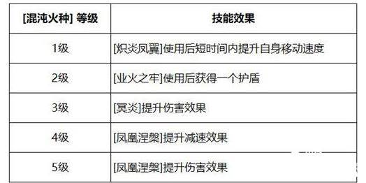 不断追逐凤凰的凤凰火,对于火种的运用也更加纯熟,被动技能“混沌火种”每升一级便会强化一个技能。随着该技能等级的提升,凤凰火在使用“炽炎凤翼”后能短时间提升自身的移动速度,在使用“业火之牢”后能获得一个护盾。不仅如此,“混沌火种”还能提升“冥焰”的伤害效果,以及提升“凤凰涅槃”的减速与伤害效果。