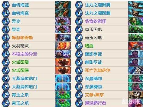 我们起手找血帆海盗、火羽精灵、青玉之爪、蛮鱼图腾,要是有低费随从的话可以直接留通道爬行者。对上快攻卡组时可以留大漩涡传送门;对上控场卡组时则可以留魅影歹徒+异变,要是手牌好的话可以留法力之潮图腾。