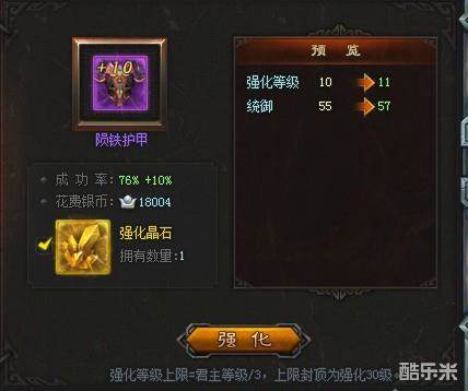 对于新手玩家来说,橙色装备是比较难获得,但我们可以通过花费银币强化来提高装备的等级,装备的等级越高,其基础属性和附加属性越高。装备强化等级上限等于君主等级的三分之一,最高封顶为强化30级。装备强化前5级的成功率为100%,从第6级强化起成功率将随装备等级的提高而降低。使用强化晶石可以提高装备强化的成功率,目前测试来看可以提高10%的成功率。因为强化晶石需要100元宝在商城见购买,在前期没有获得橙色装备的时候还是建议少用哈。