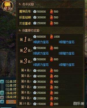击杀世界BOSS灭世董卓、妖狐貂蝉和魔神吕布,可获得大量的银币和战魂奖励。