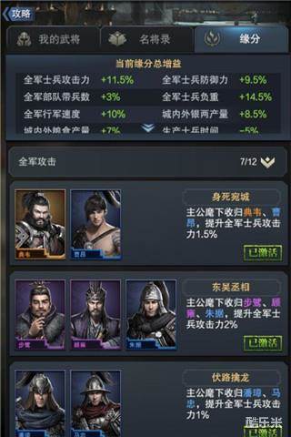 武将缘分,同样是可以为各位主公们获得增益效果,而且缘分给主公带来的是永久性增益,只要登庸缘分条目内所有武将即可激活缘分增益,下野武将后,缘分增益也依然生效。缘分增益涉及士兵属性、资源产量、士兵产量等。另外,遇到重大战役,各位主公也可以开启秘策,秘策中的厉兵秣马提高士兵攻击、步步为营提升士兵防御力,日行千里可以提升士兵的速度。