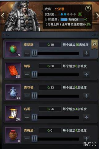 最后,小编要讲的,便是最重要的一点,武将的忠诚度!武将的忠诚度可以通过赐予武将名品来增加,但是不同名品对应武将的加成不一样。其中五维属性中武力较高的武将,建议优先培养忠诚度,可以增加全军的攻击力,而对应的优选名品则是青梅酒。名品的获取途径,可以通过击杀5级以上的土匪以及各种活动获得,如讨伐张角的活动。