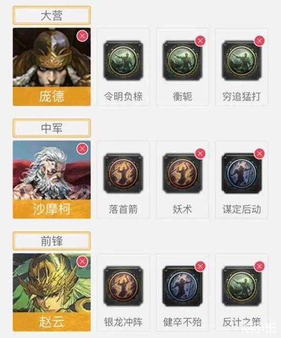 笔者根据已有的武将,选择赵云与沙摩柯与之搭配。之所以选择这两名武将主要在于笔者武将有限,如果用SP赵云或祝融夫人来取代赵云,会将队伍强度进一步提高;并且,XP庞德战法中的攻击伤害提升效果不光对普攻生效,还能作用于战法伤害,因此选择主动战法与普攻双重输出方式,可以更好地发挥出XP庞德的效果。