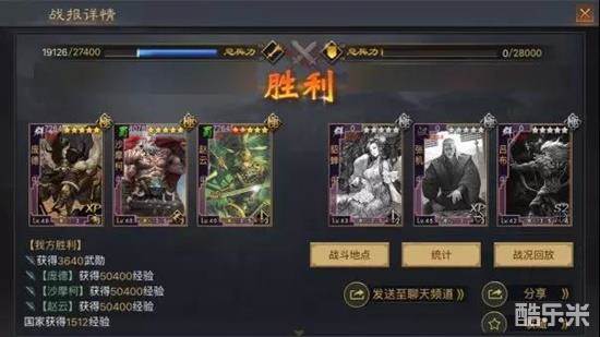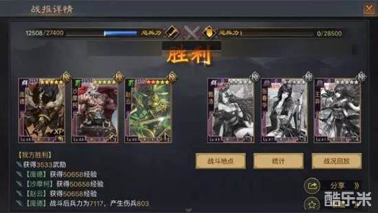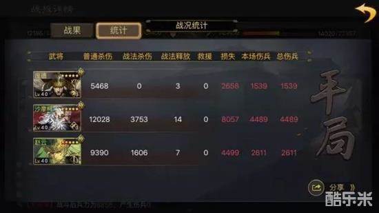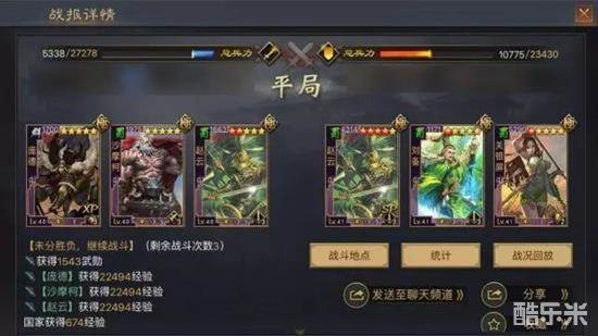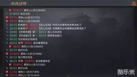 其次,本队的输出主要依靠后几回合的普攻输出与赵云的反击输出,由于【衡轭】的伤害加成可以作用于【回马】、【健卒不殆】等反击类战法,因此佩戴了【回马】的赵云往往能依靠反击打出过万的输出,【穷追猛打】也避开了前三回合经常出现的减伤类战法。