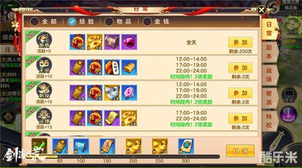 首先,《剑荡八荒》中不少玩法都为玩家提供了极为丰富的经验,包括剧情任务、经验副本、运镖、刺探,流浪谷挂机等等,分别为任务类、升级类、活动类。在游戏新手期,也就是在1-40级的时候,玩家优先完成主线和支线任务是最佳的选择,结合新手玩法教学,能够以最快最顺畅地的节奏提升实力和等级,同时了解游戏的诸多玩法,而且收获丰厚奖励,会为大家后期的成长提供基础的装备。