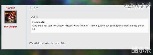 关于这款皮肤,其实最早的创意来自多年前(好像是2013年)的一位LOL粉丝,当时这个创意帖在Reddit上被讨论了120多页,在这个创意中,乌鸦的宠物不再是乌鸦,而是变成了龙,听起来就非常的cool不是吗?
