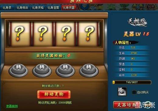 转动灵轮消耗20000铜钱一次,每天可以转动10次,转动灵轮,会出现算术,计算出的数值即是经验值,注入灵器便可获得的灵器经验值,在?处转动出数值图标,第一处、第二处、第四处,为随机数字,第三处为随机加减乘除符号,可以通过转动灵轮按钮改变转轮上的数字符号,得到更大的数值,获取更多的灵器经验。