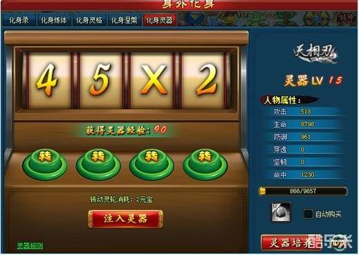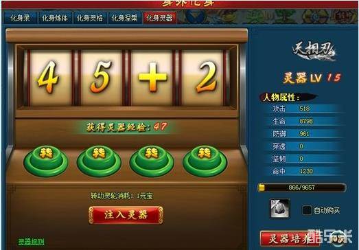 开启灵器,一般数值不会太高,如果遇到后面是2以上的数字,小编建议小R玩家花费1元宝进行转动按钮,转成乘(X),乘法获得的数值自然是最高的,所以无论如何第一时间是把第三处转动按钮为乘法(X),之后可以再花费1元宝进行第二次转动按钮,可选择在第一处或第四处,改成更大的数字,这样相互的数值就会越大,第一次第二次,转动按钮为1元宝,第三次是2元宝了!所以要适量转动按钮,相必大家的数学都不会差。