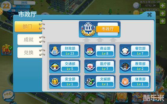首先,在部门里升级财政、商业、餐饮、交通、医疗、教育、安全、文娱、体育这些部门可以提升建筑可修建数量。每次升级消耗一定数量的金币,即可完成升级。在建筑数量达到上限后,便可以考虑花费一定数量的金币来升级部门了。