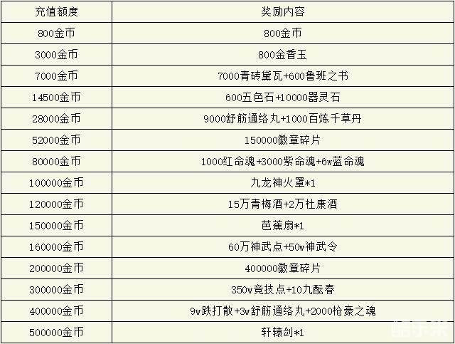 活动期间内,累计充值满100000金币以上赠送500炼阵石