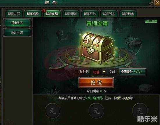 玩家加入帮派后即可开启帮派宝箱。每位帮会成员每天有6次挖掘宝箱的机会,而每次可同时挖掘宝箱3个。