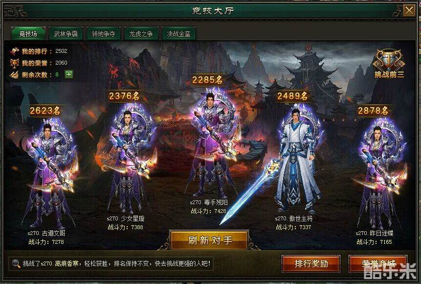 玩家在竞技场界面里,可任意挑选1名排名在自己前面对手挑战,玩家对系统展示出来的5名对手不满意,就可以使用刷新功能,重新刷新出一批新的对手。玩家可结合对手的排名和战力情况,挑选自己能对付对手切磋。若是对方战力高出自己一大截的,就不要挑战了,免得浪费每天的挑战次数。