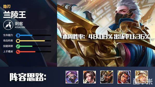 兰陵王本周胜率为48.03%,出场率为11.36%。胜率目前排在第58位,而出场率排在第31位。兰陵王的胜率不算太高,排在靠后的位置,这主要是因为兰陵王太过注重前期,前期的兰陵王优势非常大,但是越往后拖兰陵王的优势就越小,钻石及以下分段的玩家居多,这些分段的玩家滚雪球能力很弱,兰陵王带节奏能力再强也必须依赖队友才能奠定胜势,所以总体胜率不会太高。出场率处于中游的位置,兰陵王的单兵作战能力很强,所以深受玩家的喜爱,单杀是兰陵王的拿手好戏,喜欢单杀的玩家也不在少数。