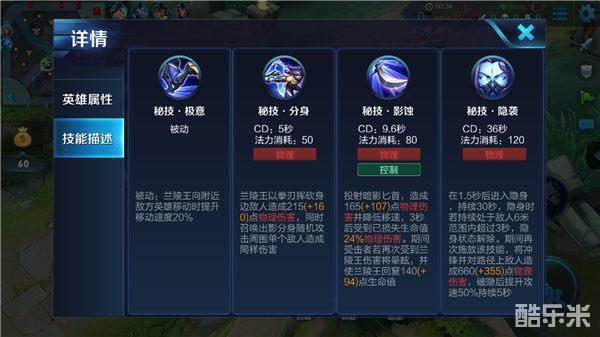 兰陵王是一个典型的刺客英雄,他的刺杀能力非常出色,虽然缺乏了一定的收割能力,但是他对后排的影响是毋庸置疑的。大招的超长时间隐身让兰陵王随时能够贴近敌方后排,也很难被对手针对。