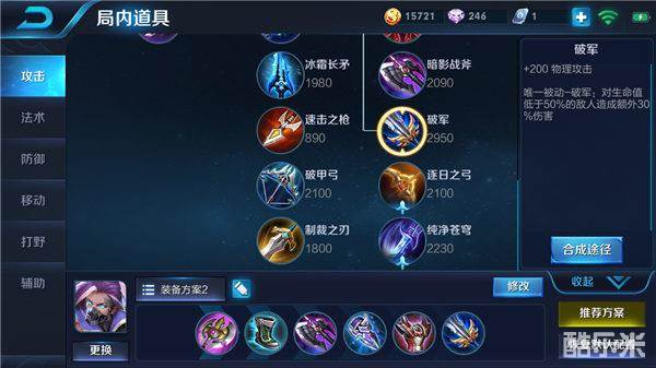 暗影战斧在前中期为兰陵王带来非常出色的输出效果,超强的随等级提升的固定物理穿透大幅度提升兰陵王对脆皮的伤害能力,此外本身的物理攻击属性优异,对于技能伤害的提升非常明显。破军拥有物理攻击加成,大幅度加强兰陵王的技能伤害,此外收割型特效也让兰陵王秒人更快。