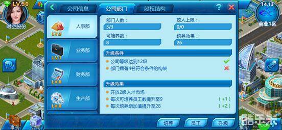 2.公司等级是玩家实力的证明,影响公司员工上限、可购地块数上限、区域发展门槛、部门开放和升级,及其他功能开放。