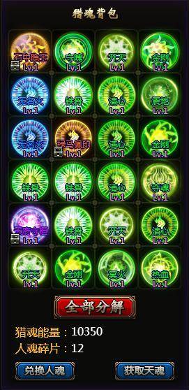 灵魂兑换:在兑换界面中玩家可以使用人魂碎片来兑换紫色和金色灵魂,甚至可以使用战勋来获得极品红色天魂哦!