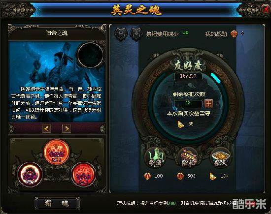 英灵之魂寄宿着四位上古英灵的魂魄,玩家可以通过战勋或元宝祭祀英灵之魂而增加友好度,当你祭祀的那位英灵友好度达到200后,就可以随机获得该英灵手中的3枚天魂之一!