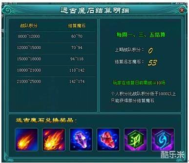 小结:每周一、三、五进行小结,根据战队积分结算成远古魔石,积分越多魔石也越多。这里注意每个玩家需要在结算周期内战斗10场才能参与结算远古魔石。