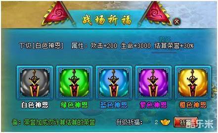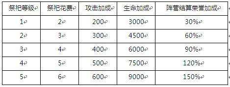 战场祭祀最多5次,祭祀即可获得攻击生命加成,此加成只有在战场有效,离开战场时消失。
