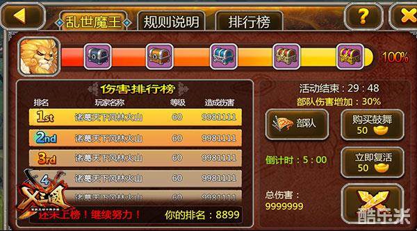 BOSS大大的实力深不可测,粗线时间飘忽不定,但是玩家等级、参与人数都会影响BOSS的发挥,只要主公们齐心协力抗击BOSS,大家都能获得不错的奖励!什么“尾刀奖”、“阳光普照奖”、“伤害排行奖”等,宝石装备元宝全部公平到手!先剧透有几个问题,主公们现在就可以开始谋划了,比如,该怎么实现伤害最大化啊,或者抢“尾刀”的技巧有哪些等等!想想就觉得超好玩的说!