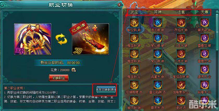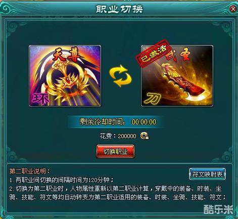 这里就是转职界面(注意:双职业切换的间隔时间为120分钟)。大家可以看到右下角有个符文映射表,这里就是各职业一一对应的技能符文表。字不如图,大家接着往下看。
