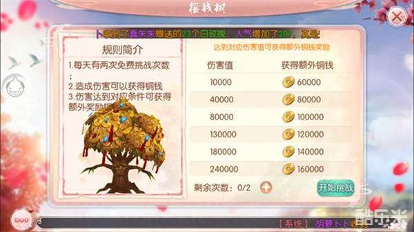 每天在活动中的两次的摇钱树任务是必须要完成的,当主角达到44级之后,每天就会拥有两次挑战摇钱树的机会,规则十分简单,只要暴打摇钱树就可以了,铜钱的数量是根据伤害值决定的。这里建议大家可以在每天完成所有活动并且提升完毕自身能力后进行,这样增加的伤害就会比较高。