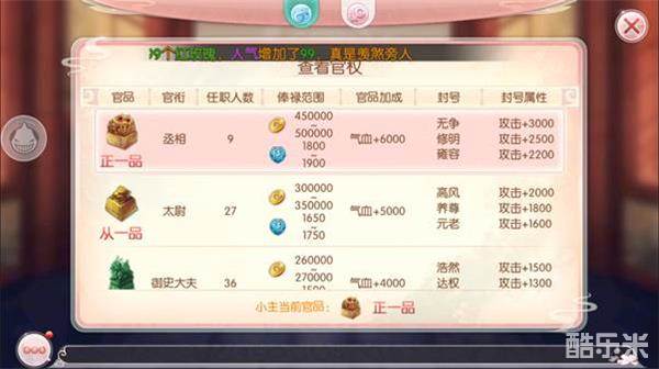 官品晋升从九品到极品共有19个等级,如果能力足够的话就可以步步高升了,每个官职每天都可以领取相应的铜钱和声望。