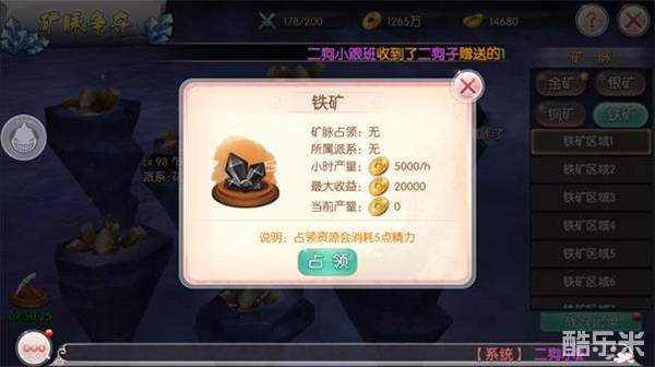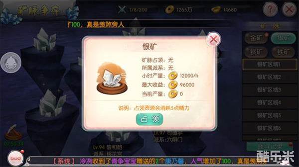 当主角等级到达54级后就可以参加矿脉争夺活动,矿脉分为金矿(每小时产量20000/h,最大收益240000)、银矿(每小时产量12000/h,最大收益96000)、铜矿(每小时产量7000/h,最大收益35000)、铁矿(每小时产量12000/h,最大收益96000)、铜矿(每小时产量5000/h,最大收益20000),如果可以占据一个金矿的话,产出收益率还是比较可观的,但是大家可以看到金矿的坑位是极少的,如果能力不足的话很可能会被人抢占的,而如果被其他玩家抢占,将会损失当前产量的50%(如果想靠抢占矿脉发财的玩家,希望你可以承受住别的玩家的怒火)