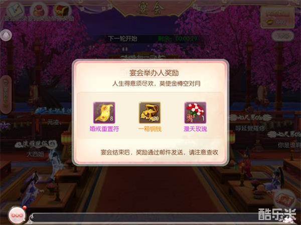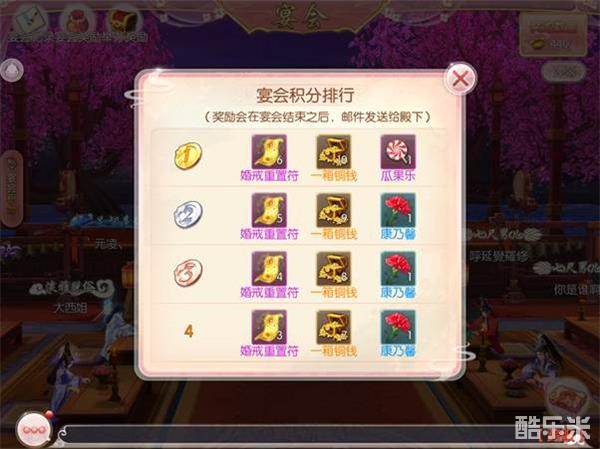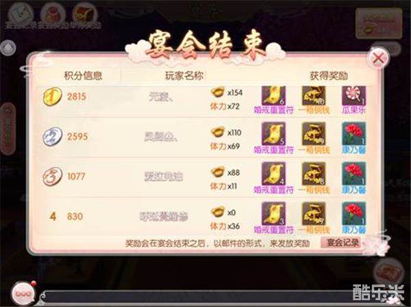 每位玩家每天有两次举办(花费388元宝)或参加(花费88元宝)宴会的机会,在宴会里玩家既可以吃包子(增加体力)也可以通过完成相应活动(猜拳)得到宴会积分,最终会根据各自的积分排名得到相应的奖励,其中举办奖励会有20箱铜钱,而积分第一名也可以得到10箱铜钱,其他排名也会得到相应铜钱,这种既可以得到体力又有奖励的活动,是不是很吸引人!