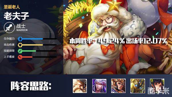 老夫子本周胜率为49.24%,老夫子的胜率虽然没有得到理想的成绩,但是排名45位也是属于中等水平,有很大提升空间。老夫子的胜率虽然并不太高,但是出场率已然达到了12.07%,这个出场率相比胜率来说还是非常不错的,排名全英雄28位也表现出了玩家对老夫子的信任与热情。可以看出老夫子作为一个热门英雄其胜率的提升空间有很大潜力,老夫子有着非常全面的能力,而胜率的提升需要玩家不断的去熟悉老夫子,并在合适的阵容配合下发挥出老夫子全部的实力。