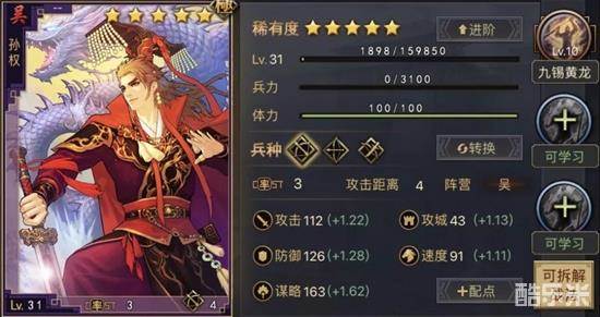 从图中可以看出,孙权基本属性与成长属性最高的是谋略,该武将在40级时,各项属性分别为:攻击124.8、防御139.2、谋略149.8、攻城55.2、速度102.2,各项属性都比较平衡。