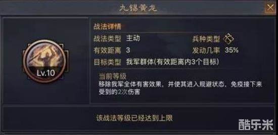 孙权自带战法为【九锡黄龙】,战法效果分两部分,前半部分是可以清除我军群体三目标的有害效果。该效果在满级情况下可以达到35%的发动机率,如果配合【形兵之极】的话可以达到45%的几率。