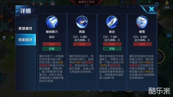 细雪:橘右京的三技能使用后能够朝指定方向连续拔刀多次,每次都能造成一定的物理伤害,且每次命中敌军后自身都能回复一定的生命值。三技能具有较好的输出能力,适合用来击杀残血英雄。