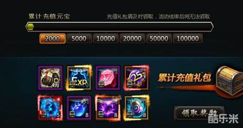 累计充值50000元宝玩家可以领取80万铜钱,神级经验丹*2(使用后增加800%杀怪经验,持续30分钟),八级生命宝石*1,神器碎片礼包(25)*15,圣物狐仙精元*100(收集1000个可以召唤强力召唤型散仙灵狐仙子)。灵气瓶(20)*100,高级强化石*80(上品装备强化的必备材料),装备进阶石*100(装备强化进阶时的必备材料)。