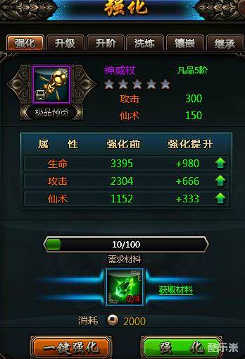 最直接的提升实力的方法就是整一套十分强力的装备。在任何游戏中装备对一个角色的提升都是最大的《九州志》也不例外。拥有一套不错的装备之后玩家还可以通过强化装备来提升自身的实力强化装备是需要消耗一定的才来哦和金钱的,根据装备等级的不同所需要的材料也不想同。强化装备的材料就是强化石。强化石的获得可以通过副本获得,或者在游戏商城中进行购买。